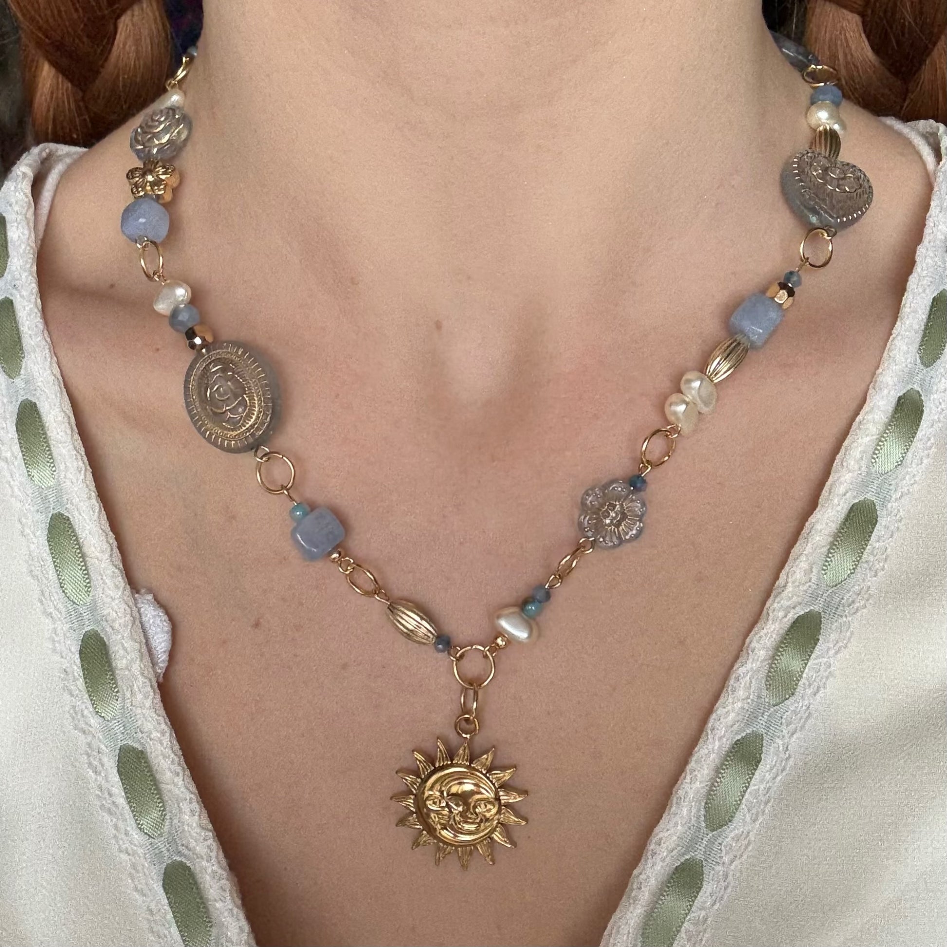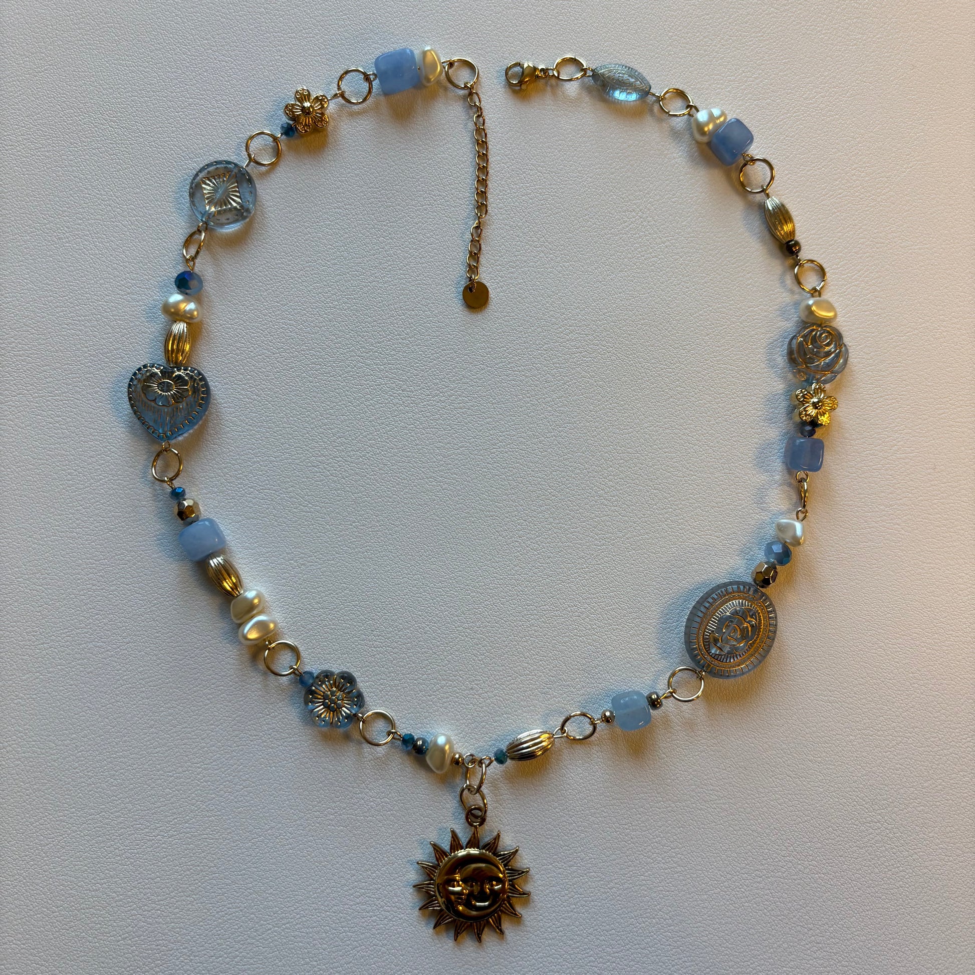 Inspired by the band's hit single 'Look at us now', this necklace features vintage-style acrylic beads, blue crystals, and agate-style beads. 🌞 A moon and sun charm adds a touch of elegance to this unique and stylish piece. 🎸