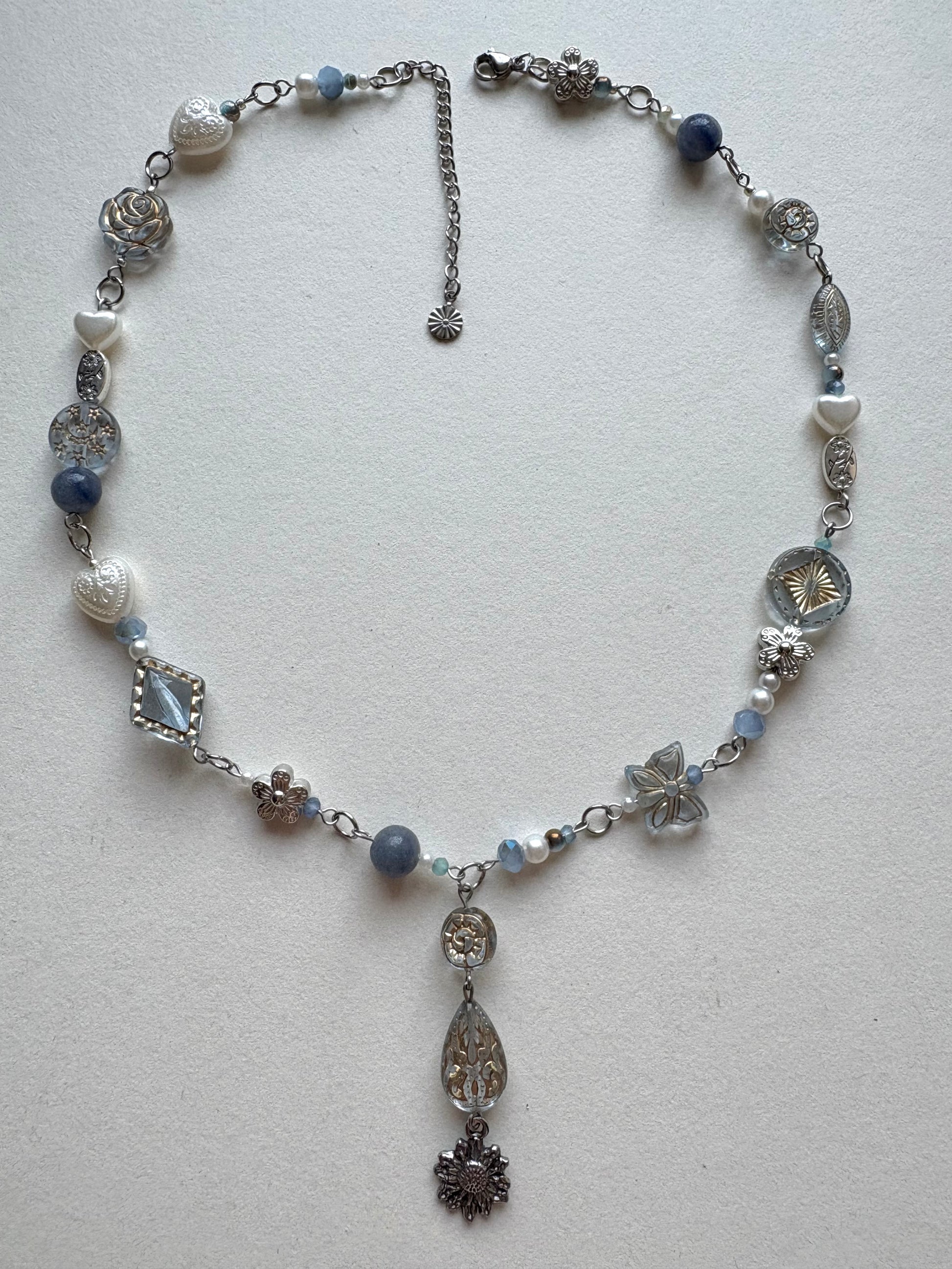 Capture the essence of Camila Dunne from Daisy Jones and the Six with this elegant necklace. The dangle design features soft shades of blue, accented with gold painted details and delicate pearls. Completed with a silver flower charm 🌸